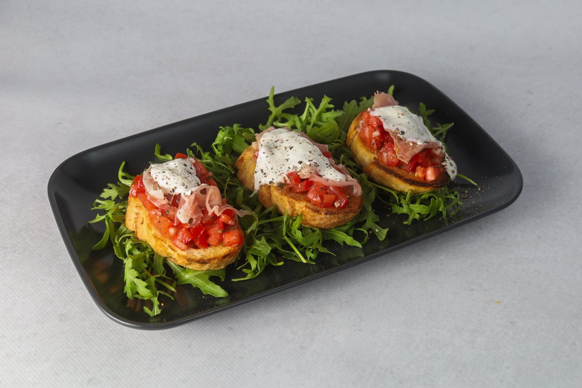 Bagietka, salsa pomidorowa, prosciutto crudo, stracciatella, świeżo mielony pieprz