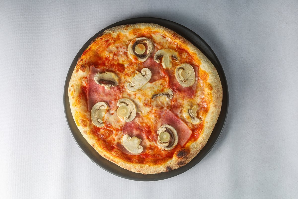Sos pomidorowy, mozzarella, cotto, pieczarki