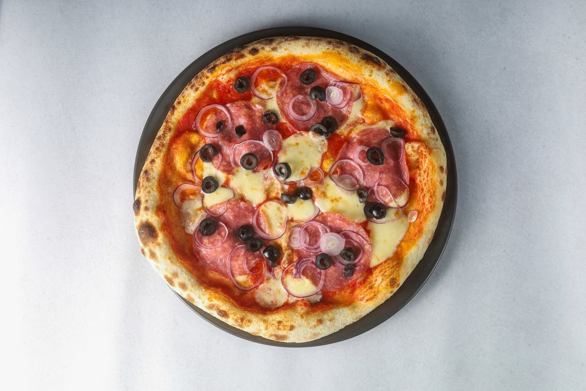 Sos pomidorowy, mozzarella, salami milano, cebula czerwona, oliwki czarne