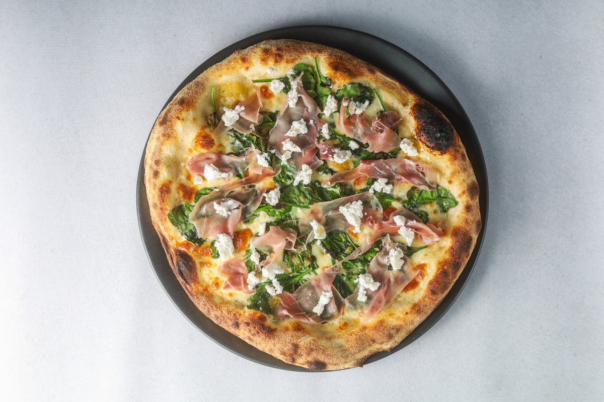 Sos biały, mozzarella, szpinak, szynka prosciutto crudo, czosnek, ricotta