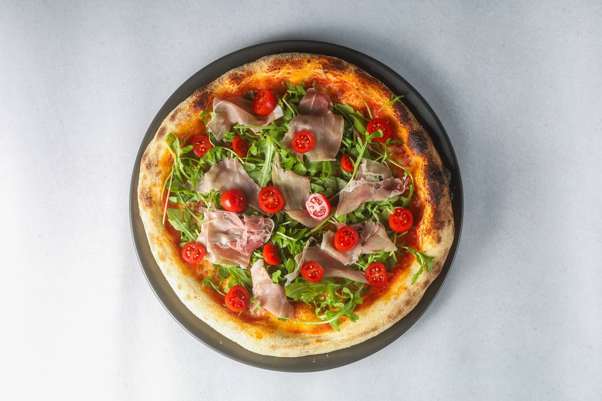 Sos pomidorowy, mozzarella, rukola, szynka crudo, pomidorki koktajlowe, parmezan