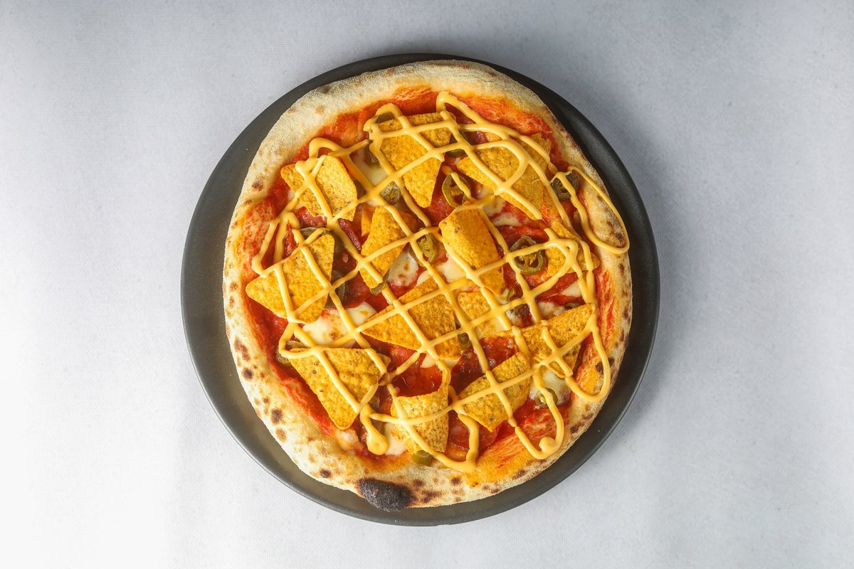 Sos pomidorowy, mozzarella, salami piccante, jalapeño, doritosy, sos serowy