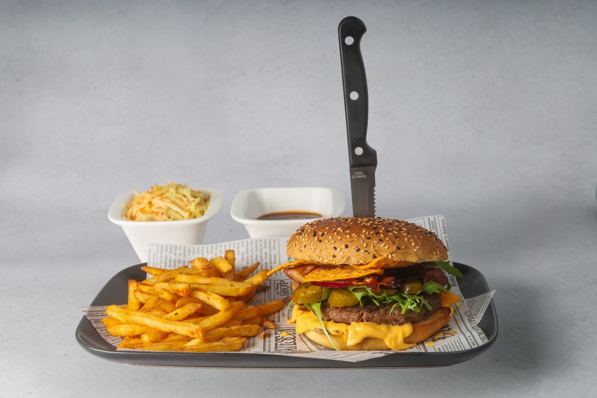 Maślana bułka, 100% wołowiny 200 g, rukola, ser cheddar, bekon, sos serowy, doritosy, jalapeño, cebula czerwona frytki 100 g, sos bbq, colesław