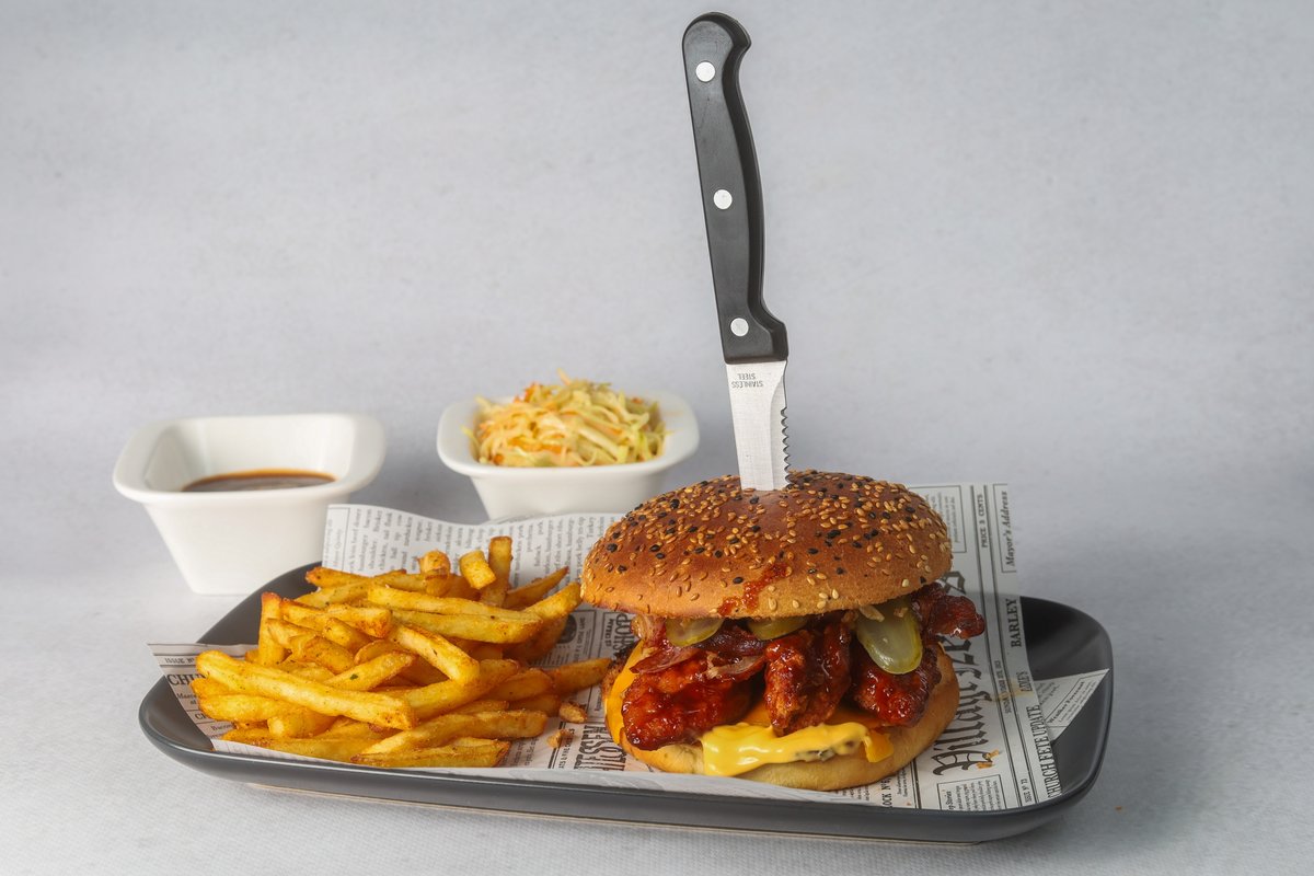 Maślana bułka, stripsy w glazurze BBQ, ser cheddar, sos serowy, bekon, ogórek kiszony, prażona cebulka frytki 100 g, sos BBQ, colesław