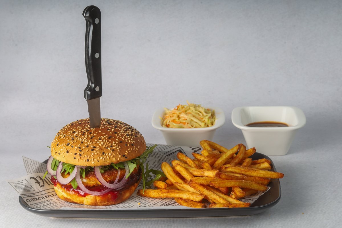 Maślana bułka, panierowany camembert, żurawina, rukola, cebula czerwona frytki 100g, sos BBQ, colesław