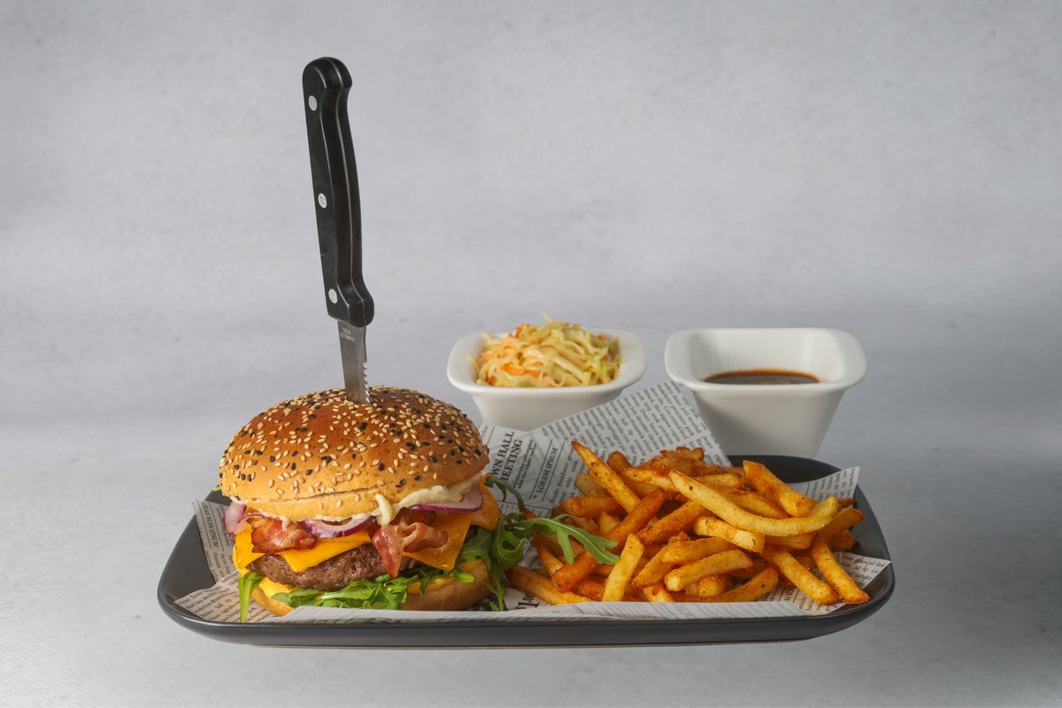 Maślana bułka, 100% wołowiny 200 g, rukola, podwójny ser cheddar, mozzarella, bekon, sos parmezanowy, cebula czerwona frytki 100 g, sos BBQ, colesław