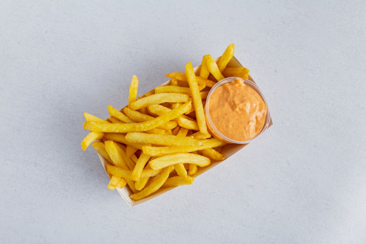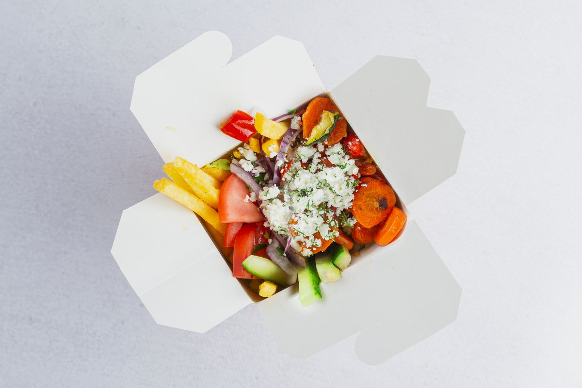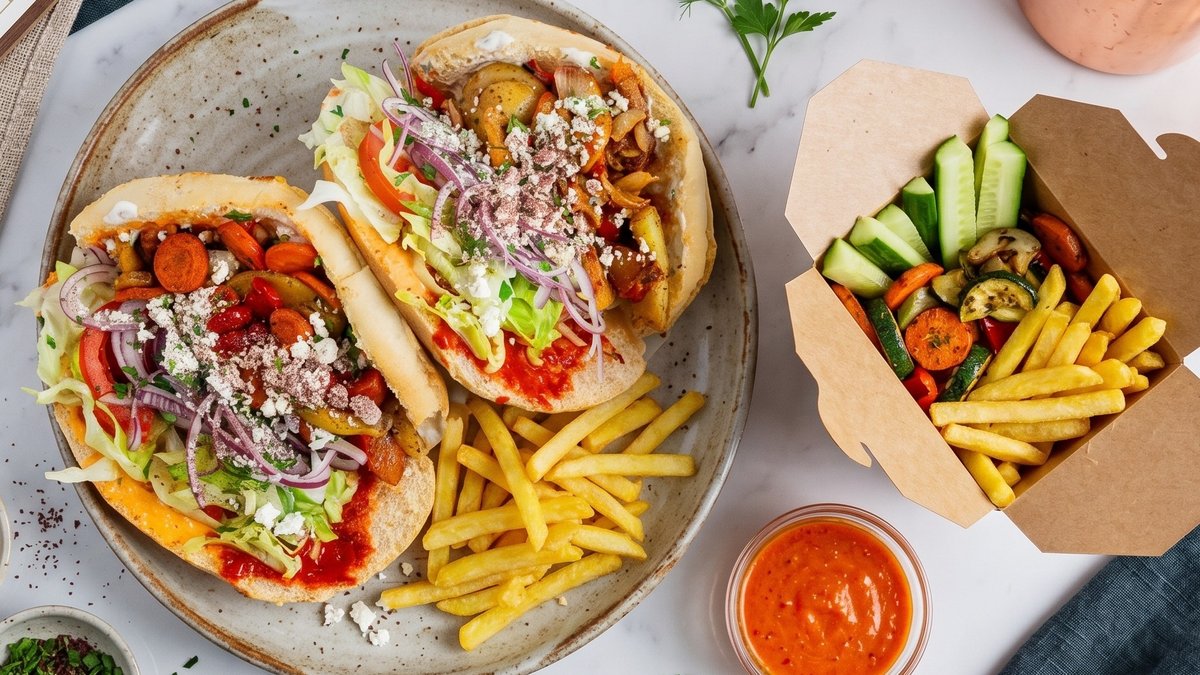 Warzywa świeże i smażone, ser turecki, frytki, sosy