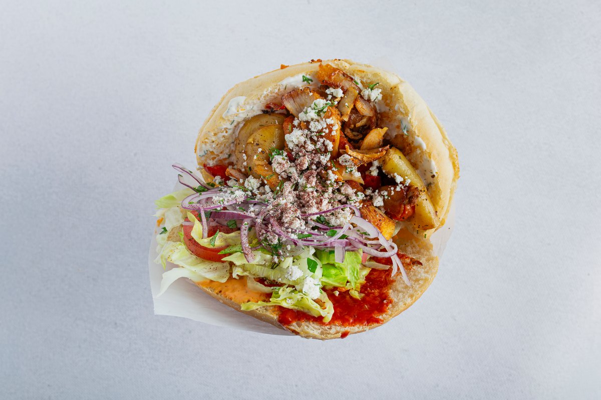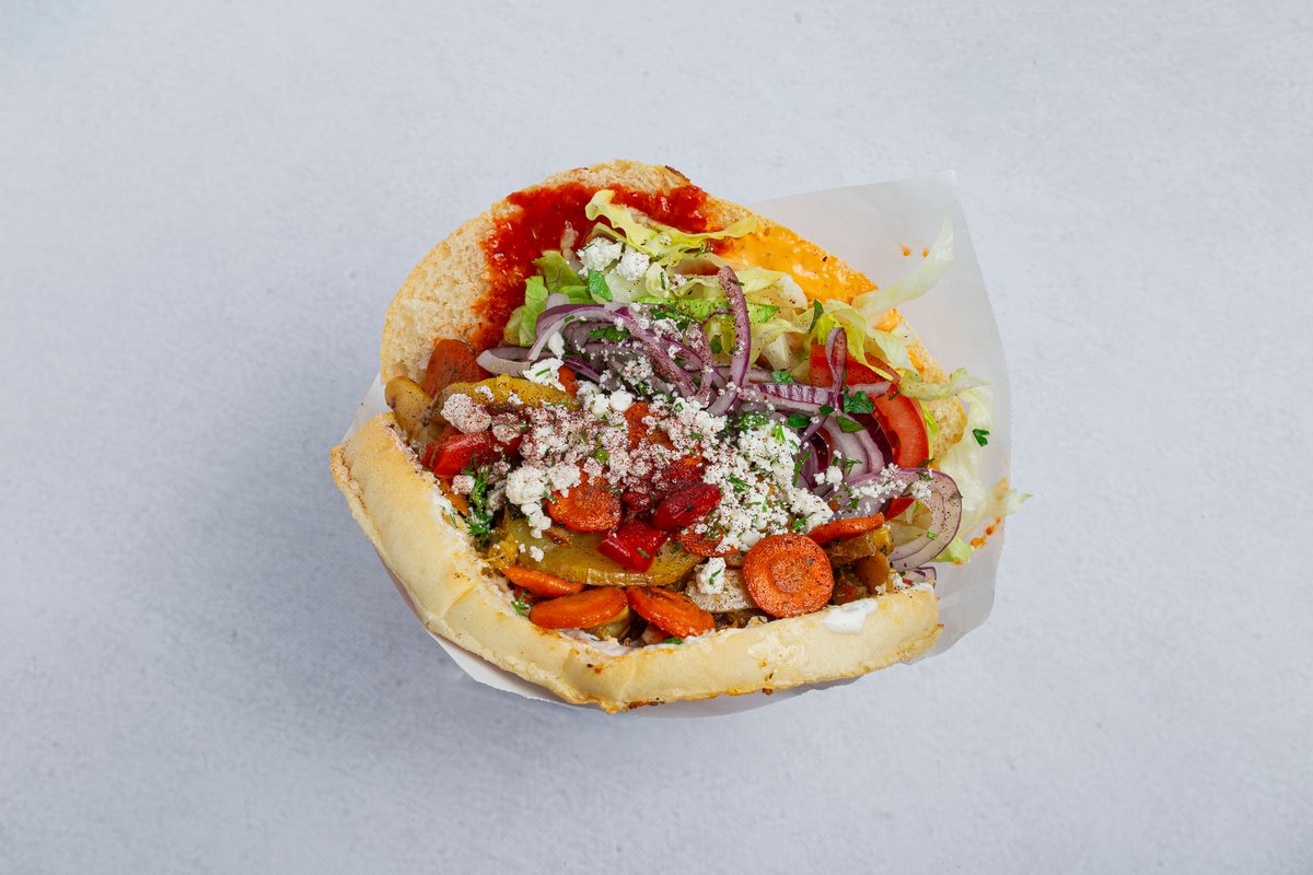 Soczysty kurczak, warzywa świeże i smażone, ser turecki, sosy, chrupiąca bułka