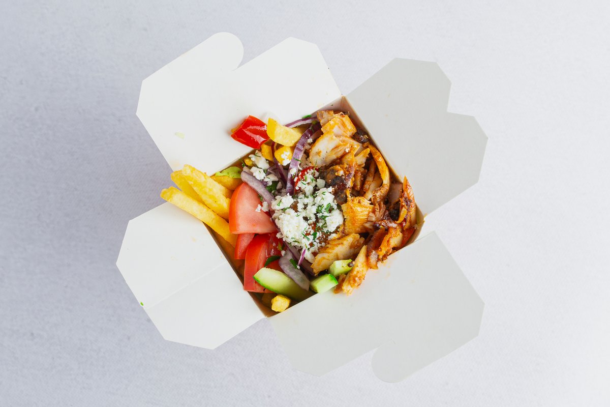 Kurczak, warzywa świeże i smażone, ser turecki, frytki, sosy