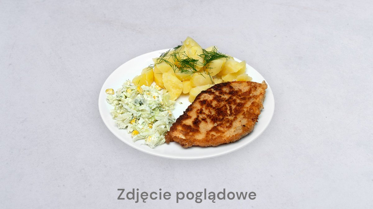 Filet zawijany z serem i szynką, z surówką, sosem oraz dodatkiem do wyboru
