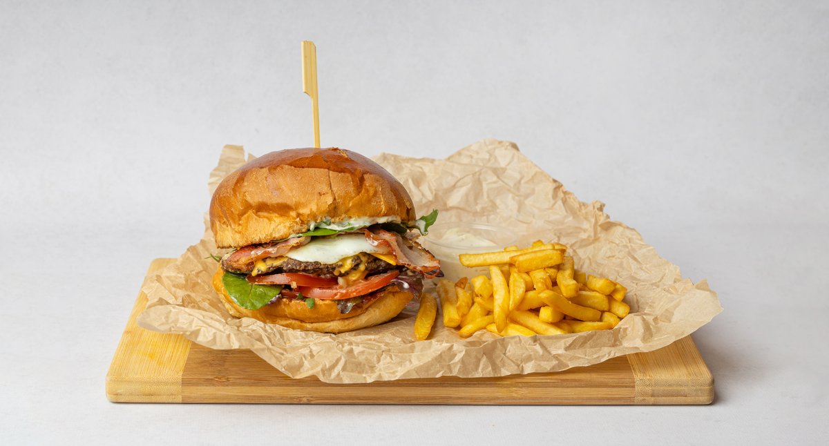 Bułka smażona na maśle, 2 kotlety wołowe, ser cheddar, sos aioli, pomidor, boczek smażony, jajko sadzone, sos BBQ, mix sałat. Podawane z frytkami + sos aioli