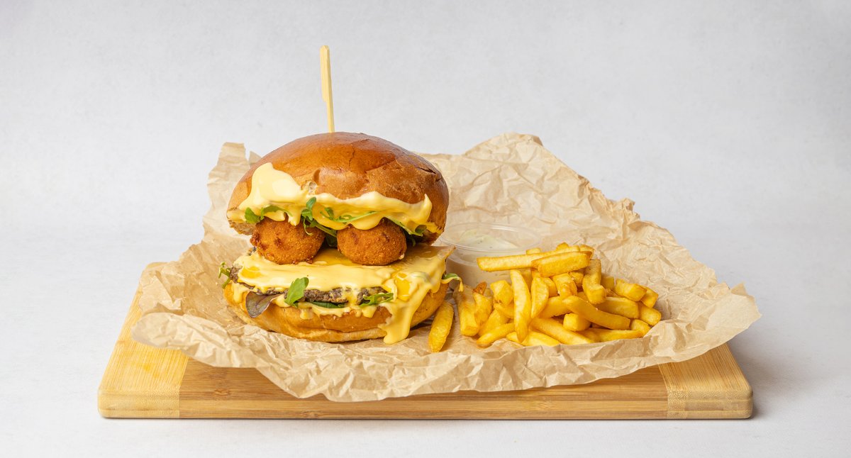 Bardzo serowy burger. Bułka smażona na maśle, 2 kotlety wołowe, ser cheddar, sos serowy, kulki serowe, chutney jabłkowy, sos aioli, mix sałat. Podawane z frytkami + sos aioli