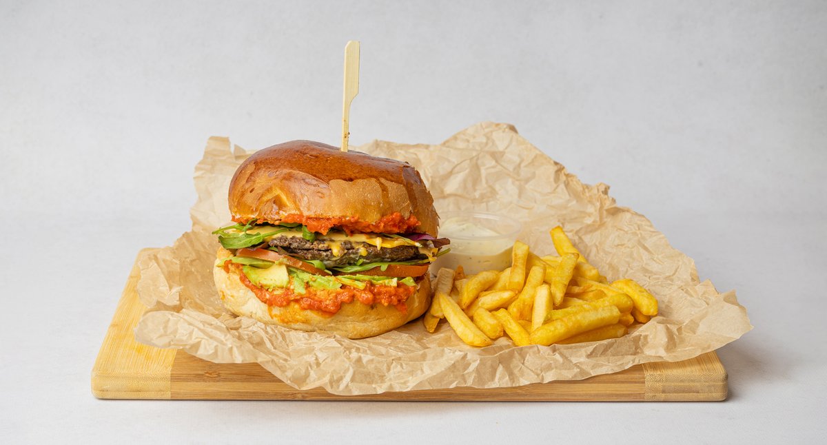Bułka smażona na maśle, 2 kotlety wołowe, ser cheddar, awokado, pomidor, sos Sweet Chili, mix sałat. Podawane z frytkami + sos aioli