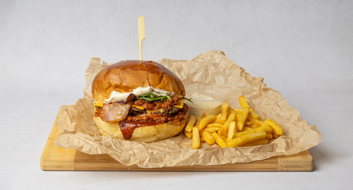 Bułka smażona na maśle, 2 kotlety wołowe, ser cheddar, smażony boczek, sos BBQ, chili con carne, pomidor, sos aioli, mix sałat. Podawane z frytkami + sos aioli