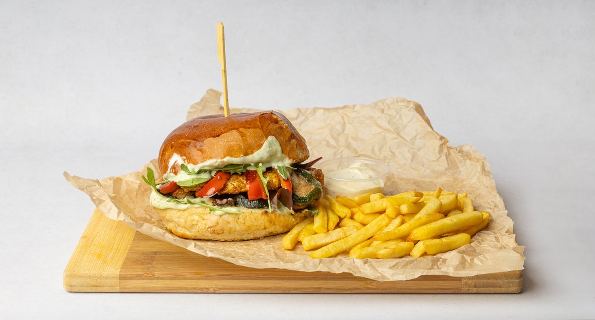 Bułka smażona na maśle, grillowany let z kurczaka, smażone pieczarki, cukinia, słodka czerwona papryka, mix sałat, sos zielony Podawane z frytkami +sos aioli
