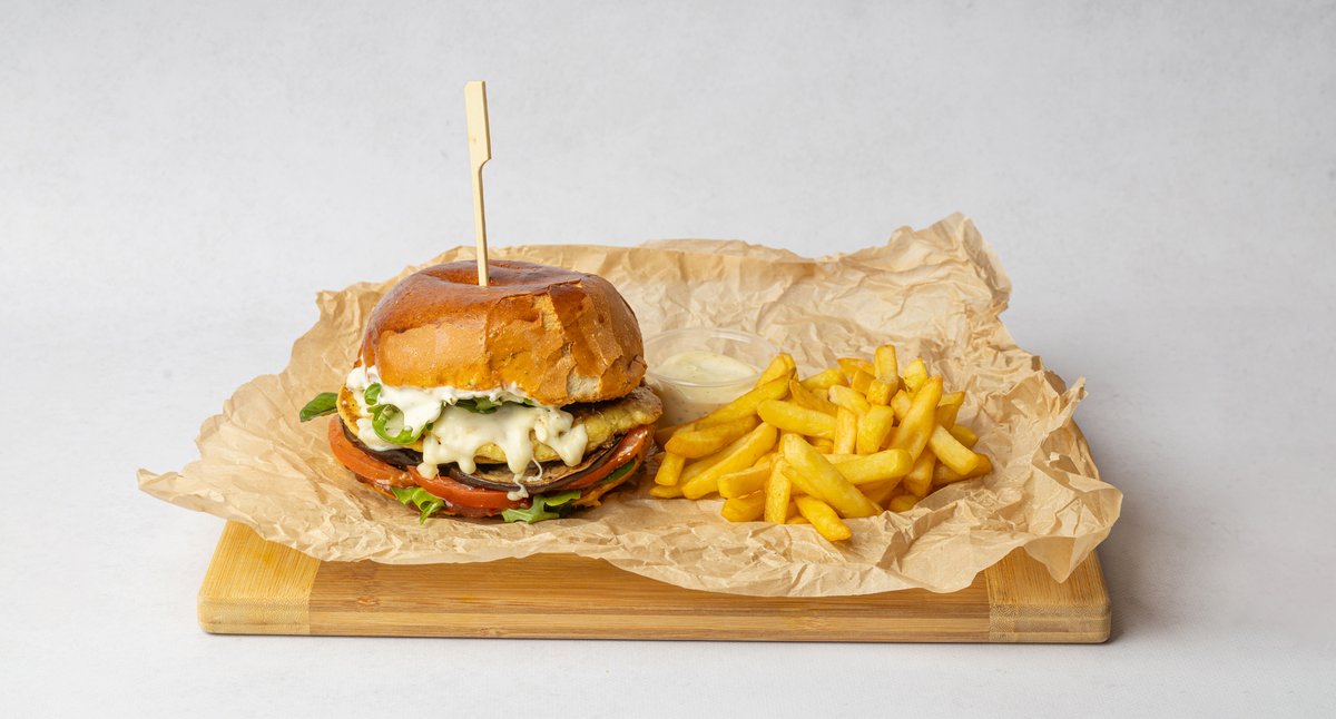 Bułka smażona na maśle, 1 kotlet ziemniaczano-marchewkowo-cukiniowy, smażony bakłażan, pomidor, ser mozzarella, mix sałat, sos aioli, sos BBQ Podawane z frytkami +sos aioli