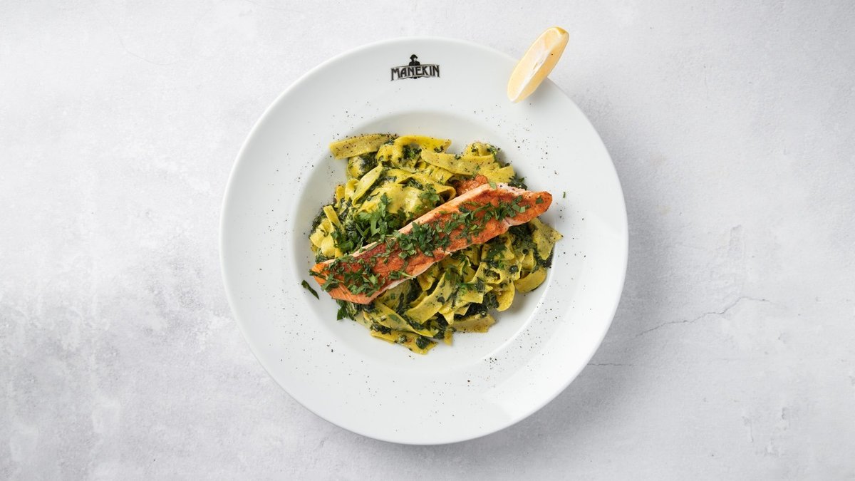 Tagliatelle łosoś grillowany ze szpinakiem i śmietaną