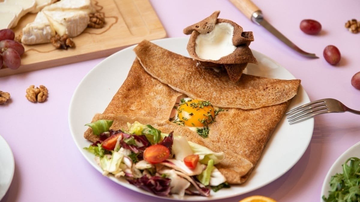2 sztuki pancake, jajko sadzone, szynka, ser mimolette, roszponka, dowolny sos. Zdjęcie poglądowe