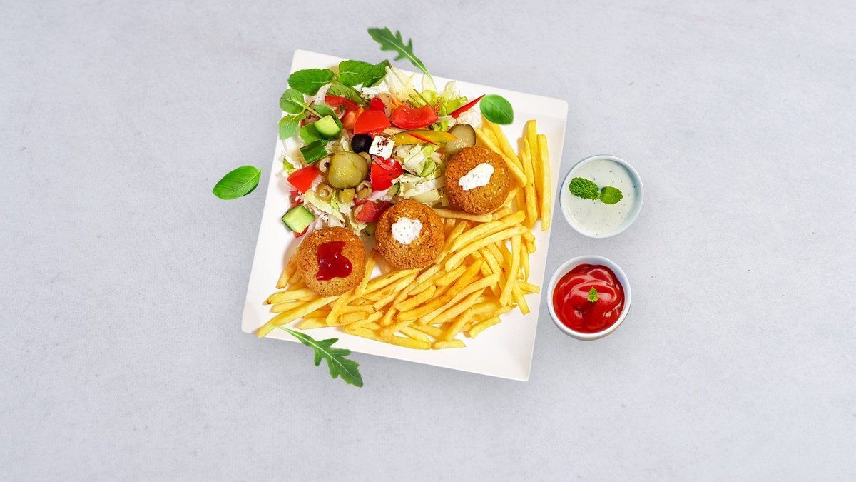 Falafel, surówki (ogórek, pomidor, papryka, cebula), frytki, sos
