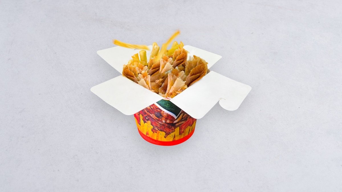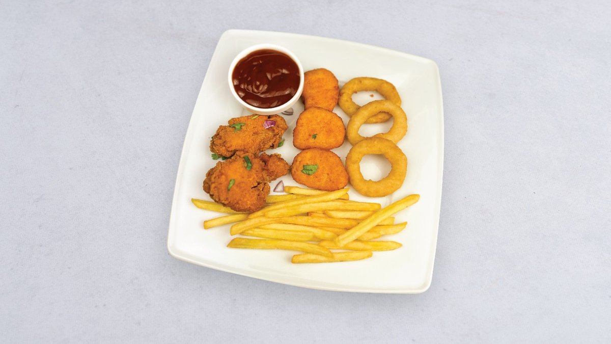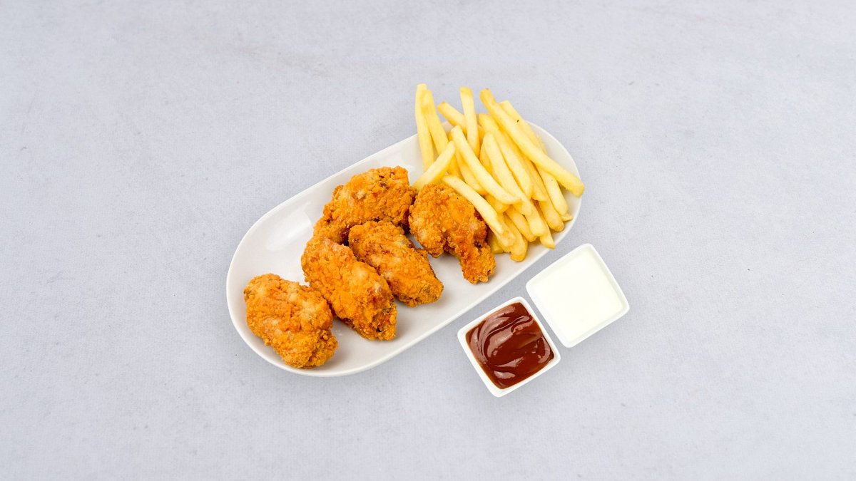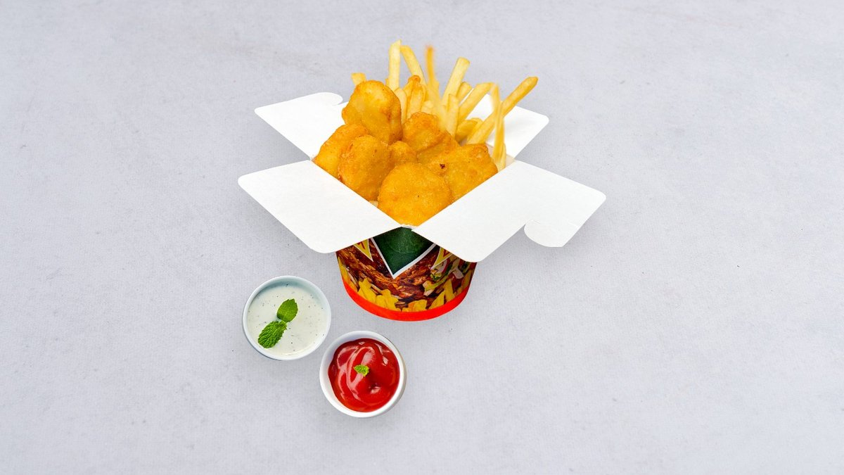 Panierowane skrzydełka z kurczaka (2szt.), nuggetsy (3szt.), krążki cebulowe (3szt.), frytki, sos