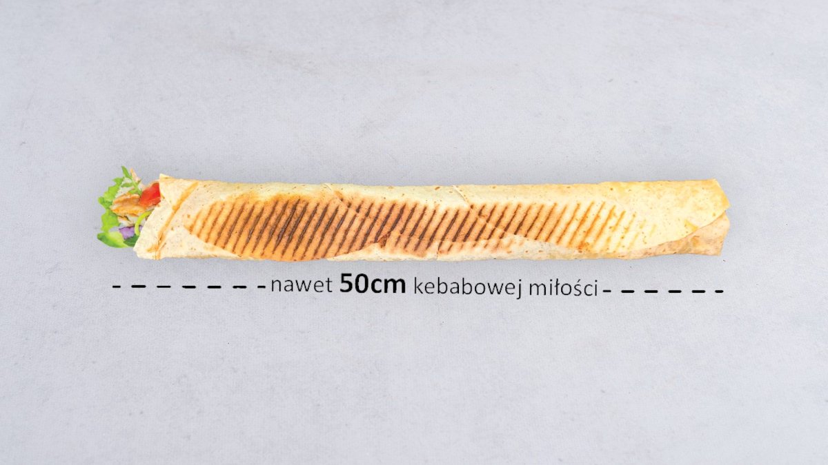 Nawet 50cm kebabowi miłości tortilla, kurczak/wołowina/mięso mieszane, surówka/frytki, ser, sos