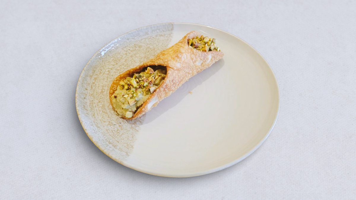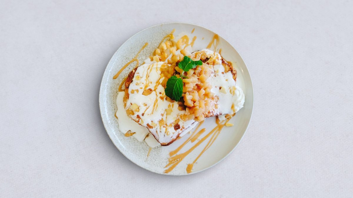 Brioszka naszego wypieku, prażone jabłka z cynamonem, słony karmel, krem śmietankowy, prażynka