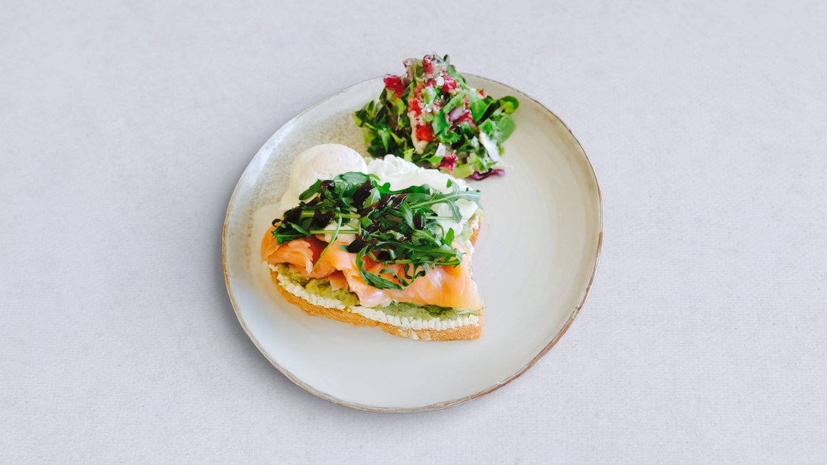 Brioszka naszego wypieku, 2 jajka poche, wędzony łosoś, serek śmietankowy, awokado , mini sałatka z sosem szpinakowo-miodowym