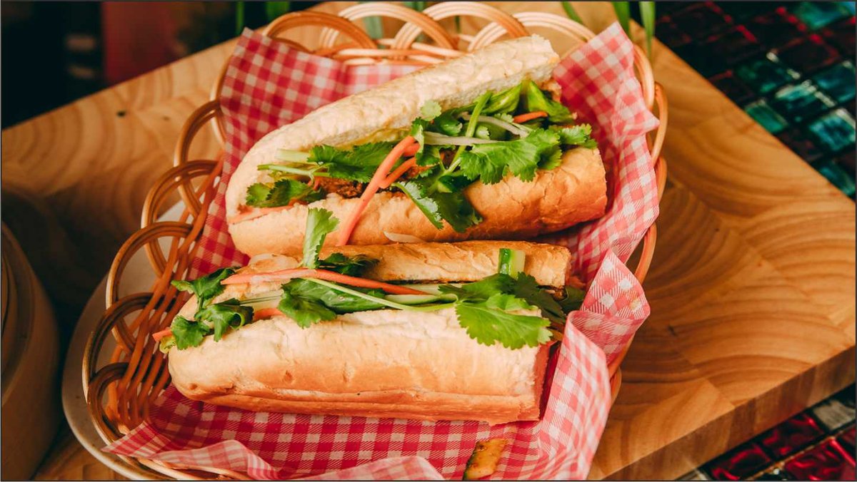 Chrupiąca bagietka wietnamska. Pikle (marchew i rzodkiew), ogórek, sałata, kolendra. Nie zamieniamy i nie usuwamy składników z kanapki.