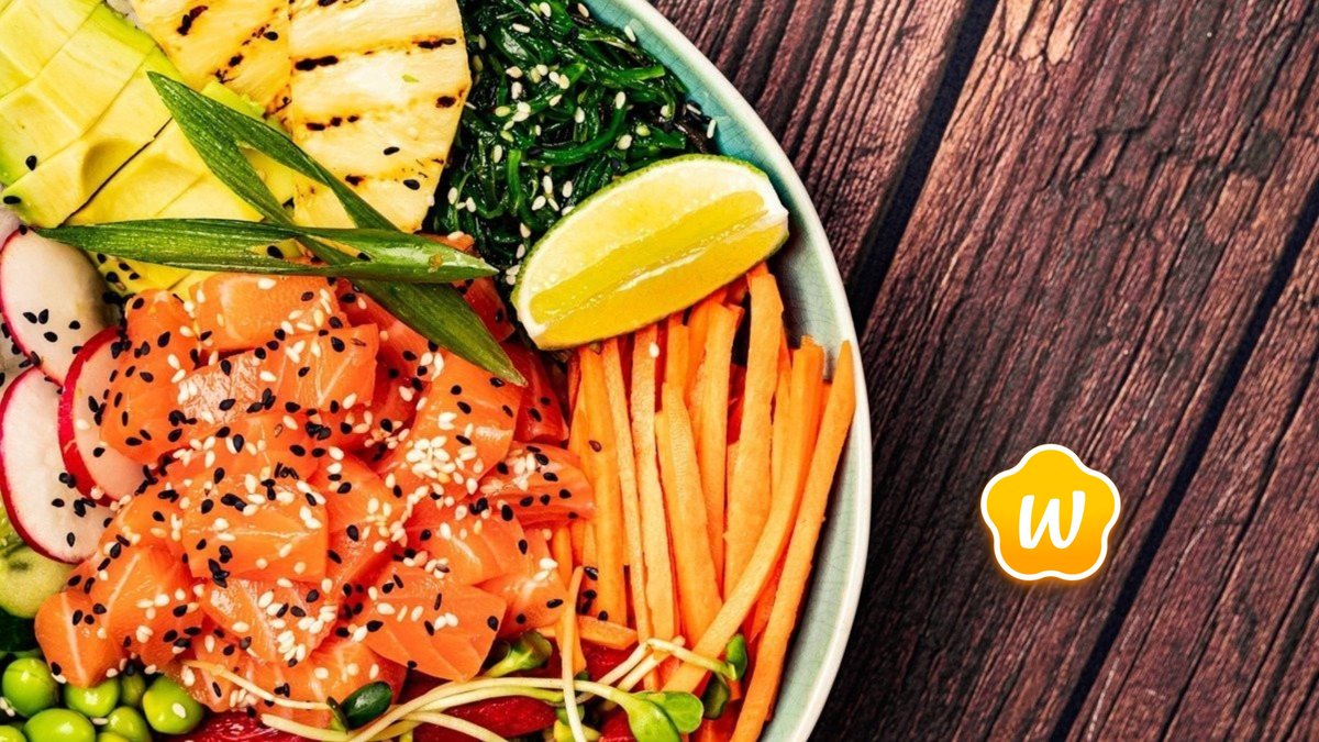 Poke z surowego łososia, sałatka goma wakame, ananas, edamame, awokado, tykwa, migdały, furikake, granat, dymka, płatki nori, imbir, limonka. Waga dania może różnić się od podanej w zależności od wybranej bazy i dressingu np. z sałatą będzie lżejszy.