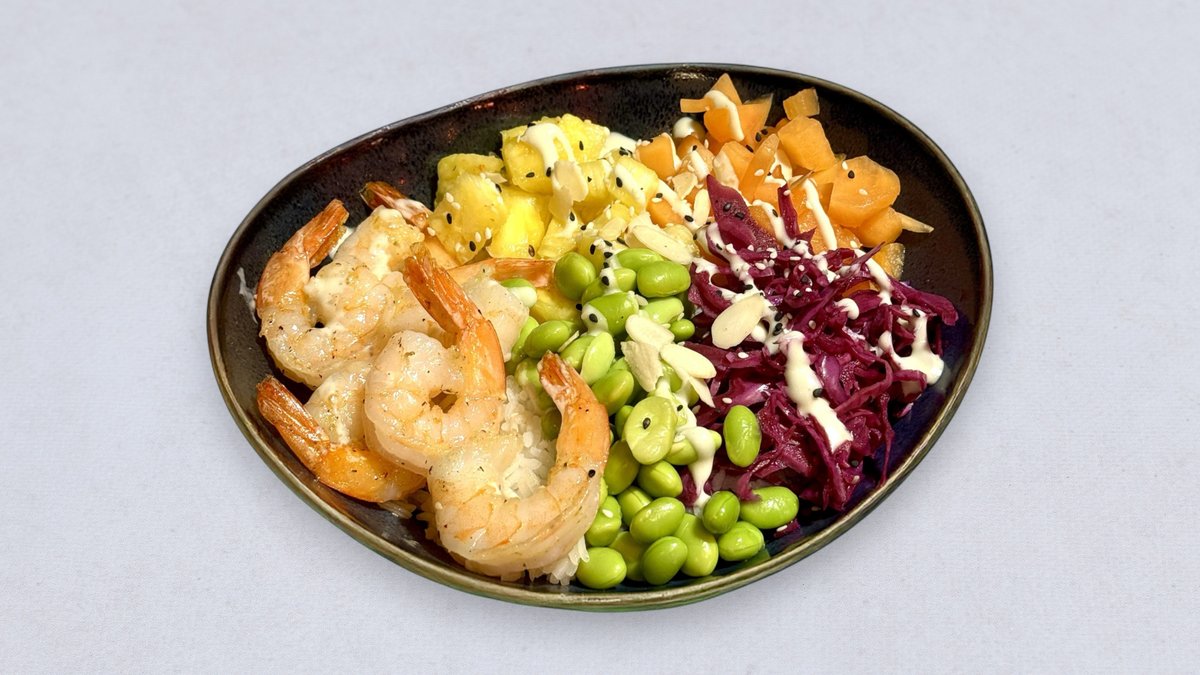 Grillowane krewetki, melon, cynamonowa modra kapusta, ananas, edamame, szczypior, sezam, prażone migdały,furikake. Mały bowl 4 krewetki, duży 6 krewetek. Waga malego około 400g, dużego około 500g. Podane wagi dań są przybliżone i zależą od wyboru bazy np. z sałatą będzie mniejsza waga.
