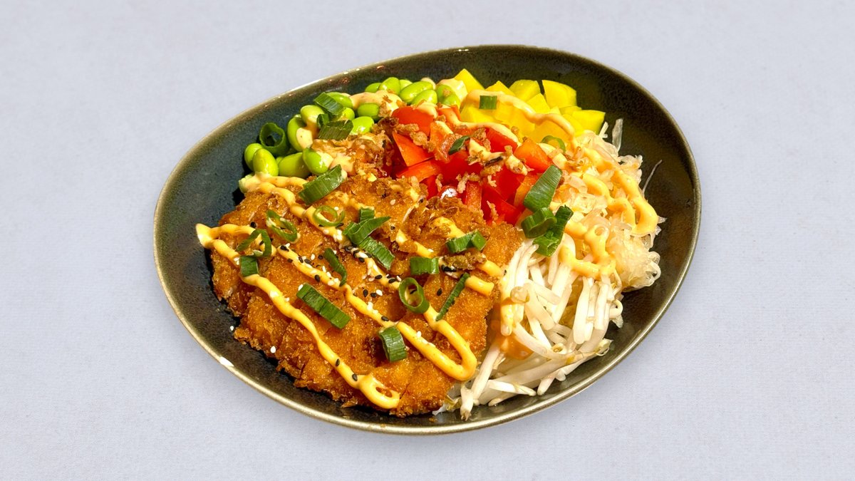 Pierś z kurczaka panierowana w panko, coleslaw, marynowana rzodkiew, edamame, czerwona papryka, kiełki mung, szczypior, chrupiąca cebulka, sezam. Waga dania może różnić się od podanej w zależności od wybranej bazy i dressingu np. z sałatą będzie lżejszy.