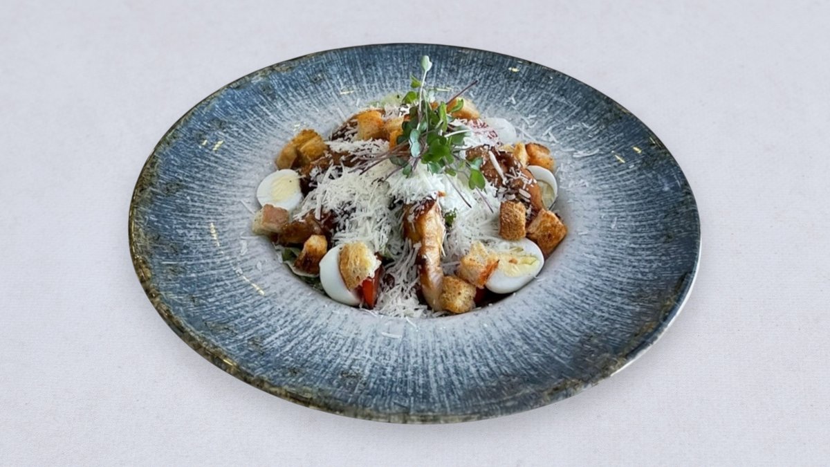 Łosoś grillowany, pomidory cherry, jajko przepiórcze, parmezan, mix sałat, sos cezar, grzanki