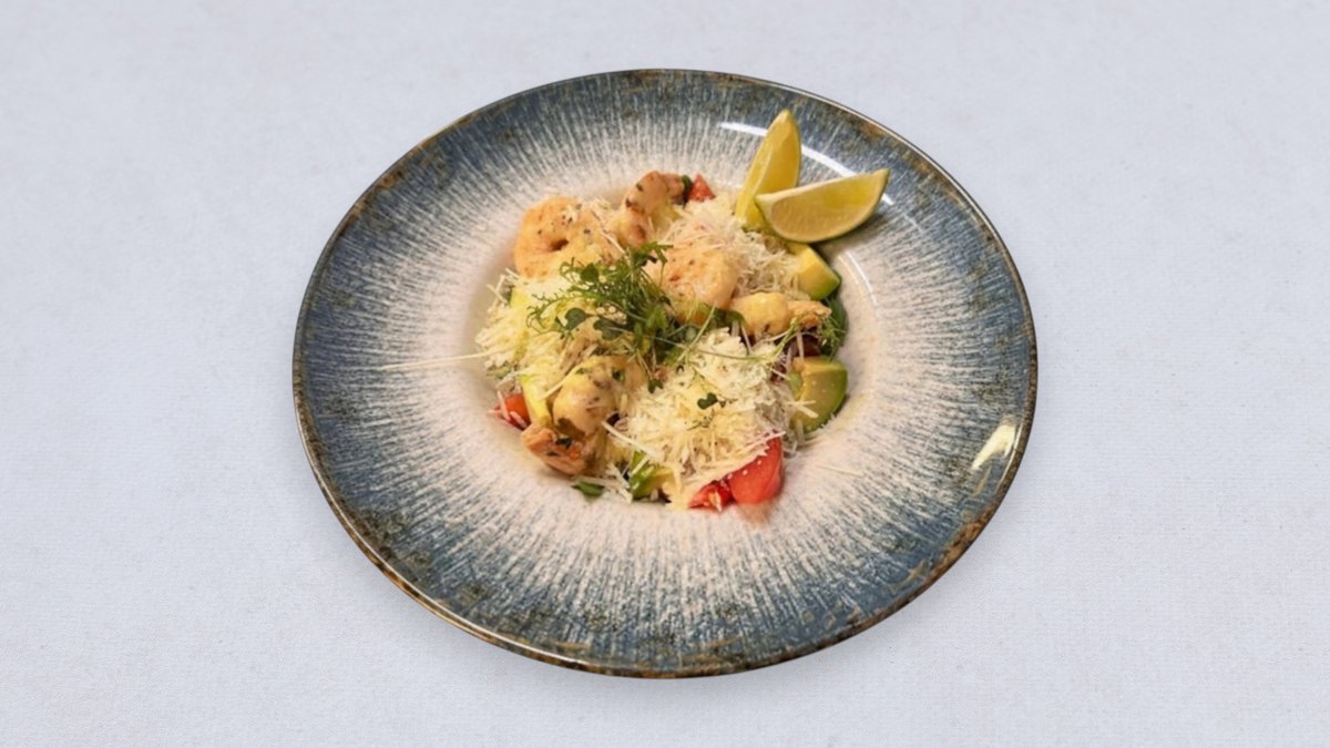 Krewetki, rukola, parmezan, pomidory, awokado, cytryna, sos śmietankowy