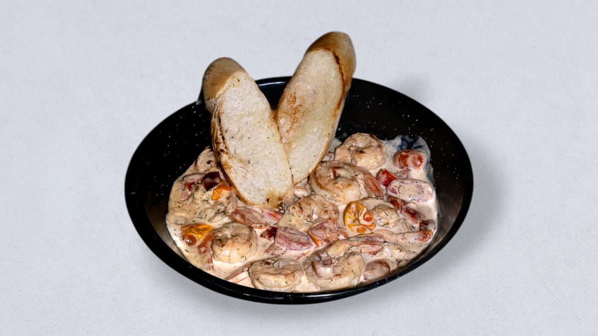 smażone krewetki z pomidorami w winie z czosnkiem i sosem śmietankowym