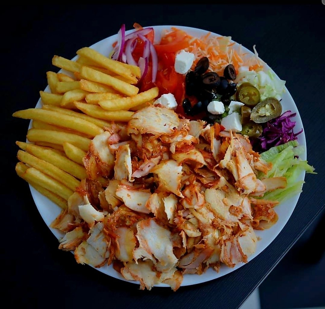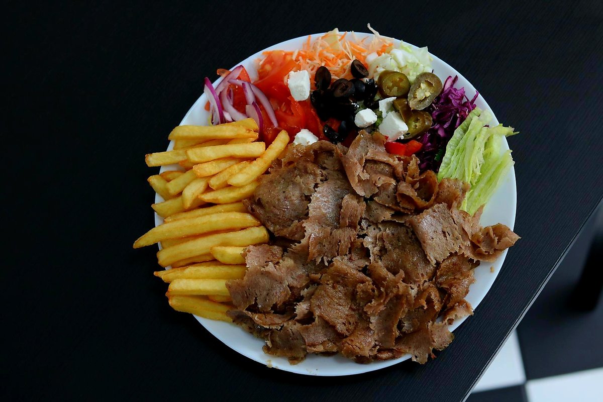 Mięso, frytki, warzywa (pomidor, ogórek, cebula), surówka (kapusta pekińska), sos. Zdjęcie poglądowe