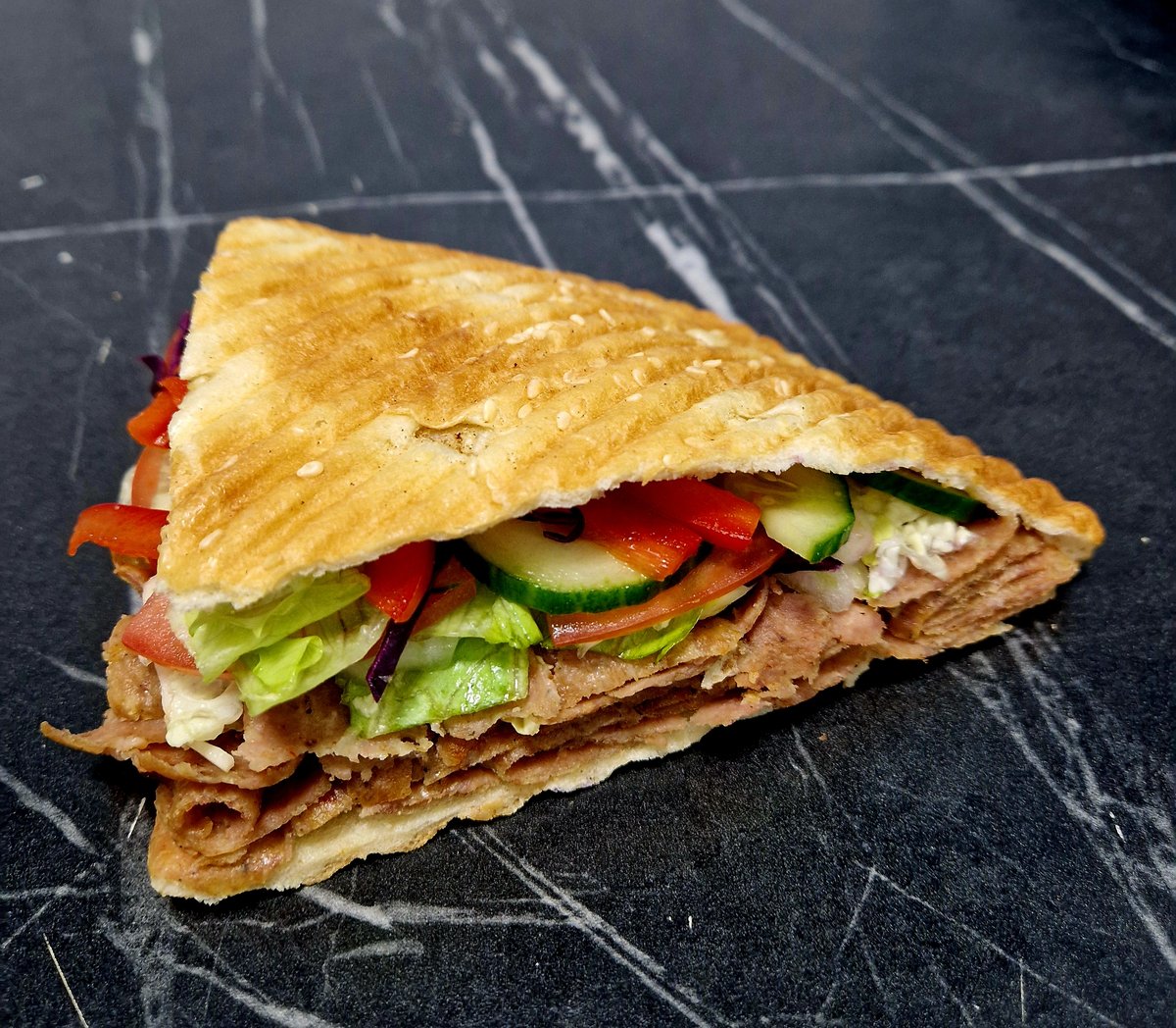 Mięso, ser, surówka, warzywa (pomidor, ogórek, cebula), sos