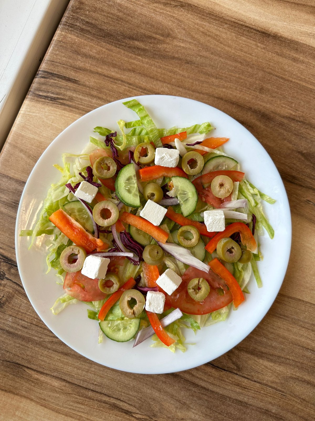 Pomidor, sałata lodowa, oliwki, ogórek, papryka, ser feta, sos. Zdjęcie poglądowe