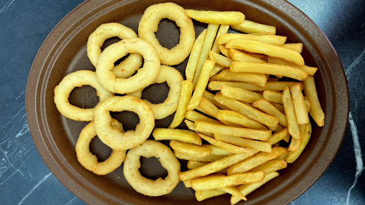 Krążki cebulowe, frytki, sos. Zdjęcie poglądowe
