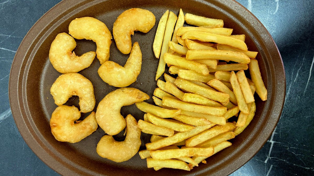 Krewetki, frytki, sos. Zdjęcie poglądowe