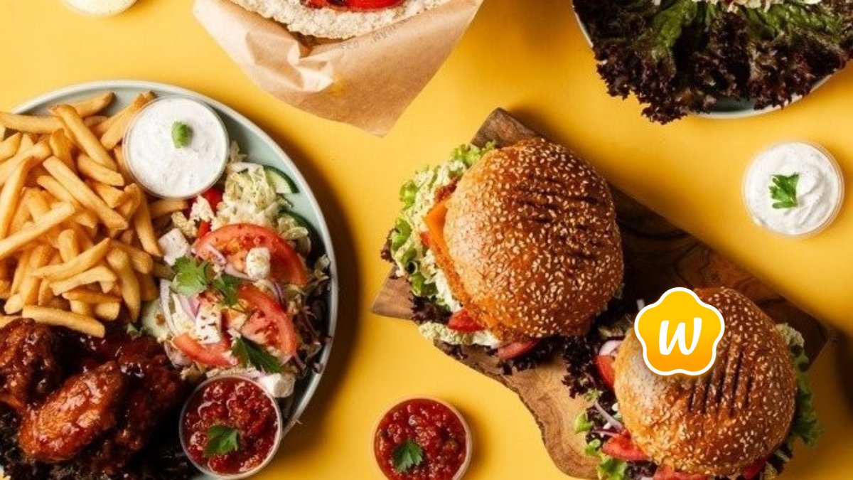 Podwójne mięso, warzywa (pomidor, ogórek, cebula), frytki, surówka (kapusta pekińska), sos. Zdjęcie poglądowe