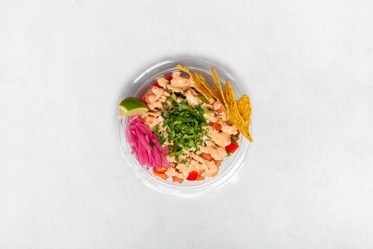 Ryż, fasola, ser, marynowana kapusta, szczypiorek, pomidory, papryka, kolendra, limonka, salsa do wyboru. Rodzaj miski do wyboru