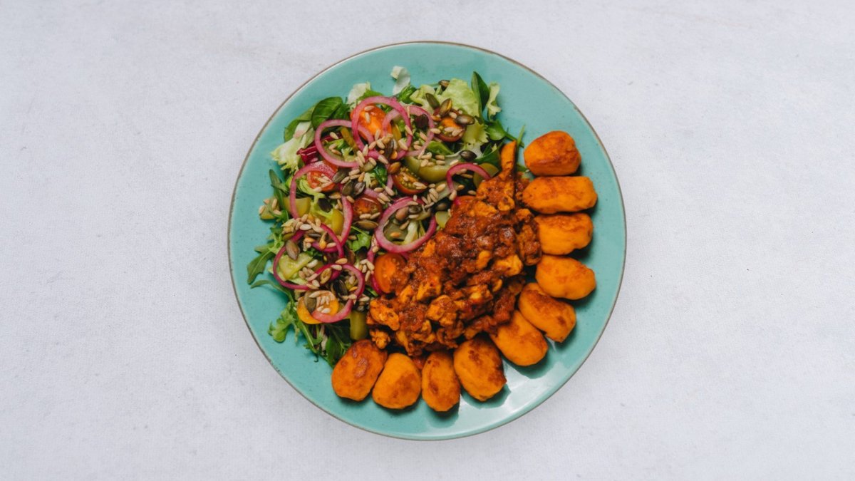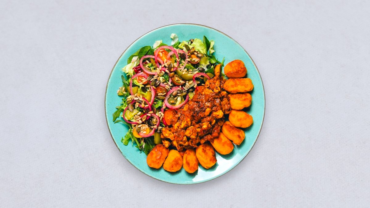 Domowe nuggetsy z kurczaka w panko, smashed ziemniaczki, surówka z marchewki z jabłkiem, ketchup Alergeny: gluten, jajka, laktoza, siarczany