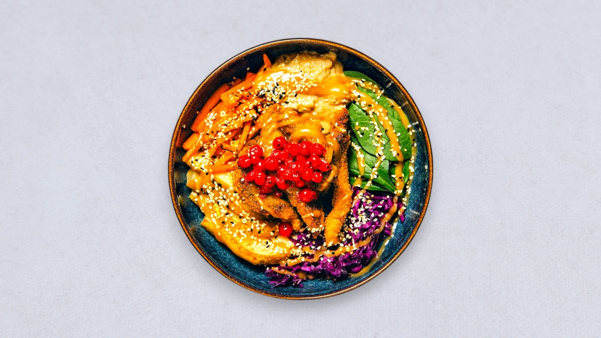 Czerwony ryż, pieczona marchew gochujang, azjatycka modra kapusta, pasta z bakłażana z miso i syropem klonowym, panierowane boczniaki, korzenna gruszka, sos orzechowy, czerwona porzeczka, sezam czarny i biały Alergeny: gluten, sezam, orzechy arachidowe, siarczany