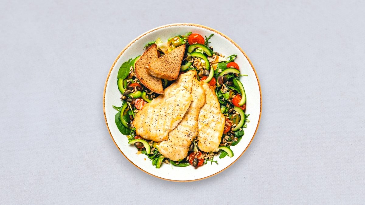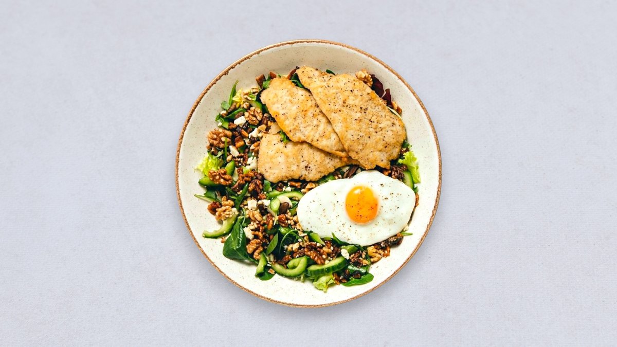 Grillowane kawałki piersi z kurczaka, sałatka z ogórkiem, ser bałkański, jajko sadzone, boczek, oliwa czosnkowa, prażone włoskie orzechy, prażone pestki Alergeny: laktoza, orzechy włoskie, jajka Oznaczenia: keto, bez glutenu