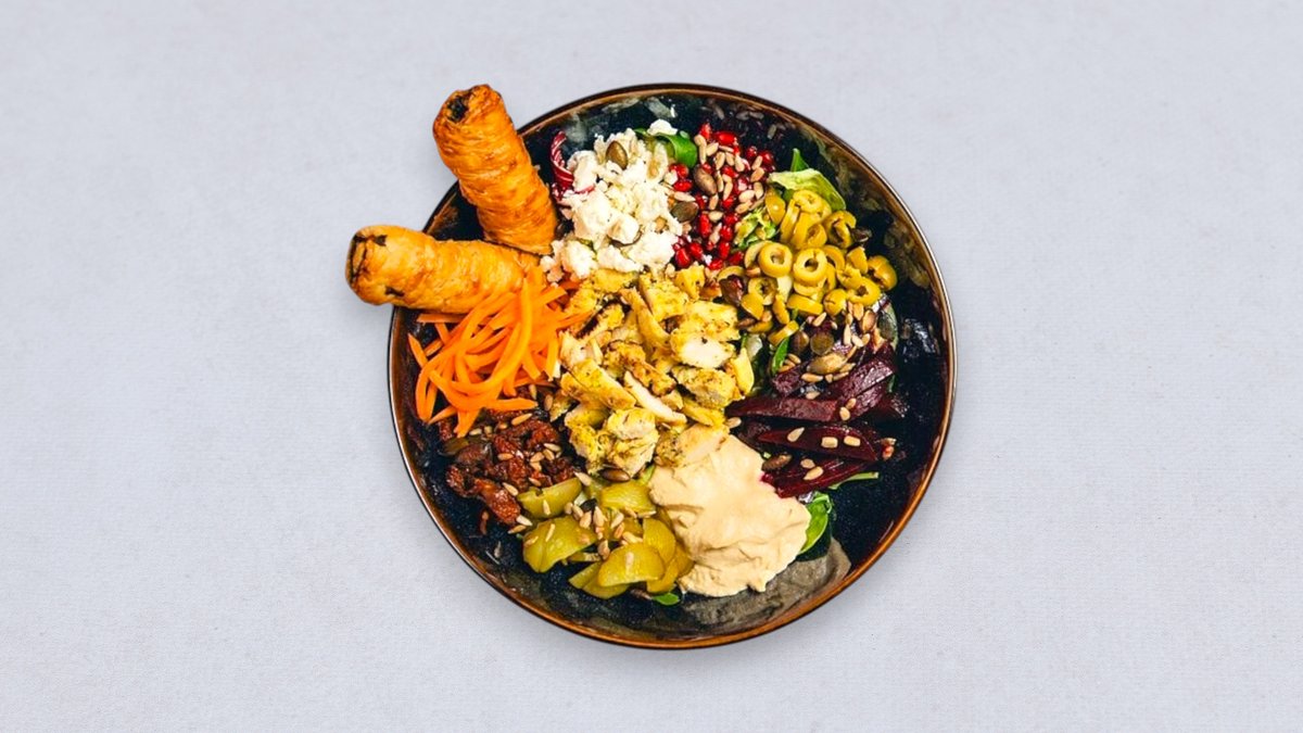Sałaty, bazyliowy dressing, pieczone kawałki cytrynowego kurczaka, hummus, marynowane buraki, kiszony ogórek, suszone pomidory, piklowana marchew, ser bałkański, granat, zielone oliwki, prażone pestki, borek z serem i szpinakiem Alergeny: gluten, laktoza, orzechy włoskie, sezam, siarczany, gorczyca