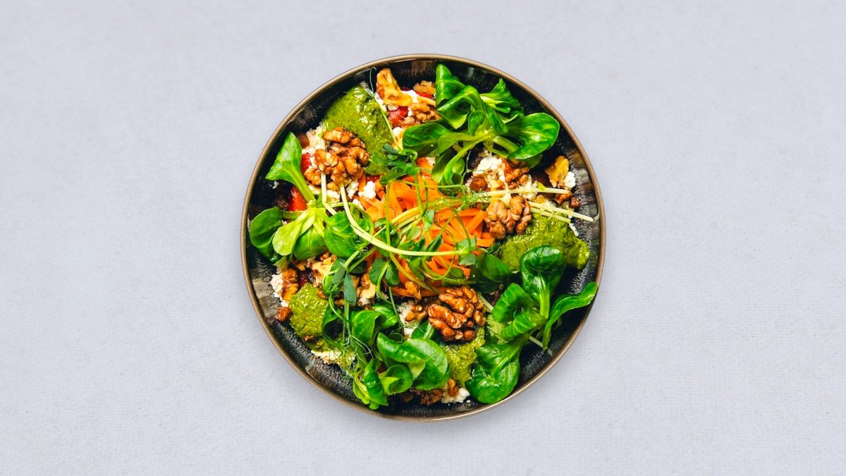 Kopytka buraczane podsmażane na maśle, wędzony twaróg, piklowana marchew, bazyliowe pesto, orzechy włoskie, skwarki z wędzonego tofu, roszponka, kiełki groszku, oliwa czosnkowa Alergeny: gluten, jajka, laktoza, orzechy włoskie, siarczany, gorczyca, soja