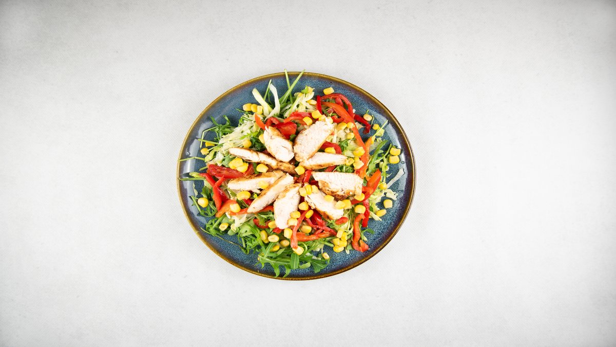 Mix sałat z papryką, kukurydzą, przyprawami, ziołami, pieczonym kurczakiem i sosem