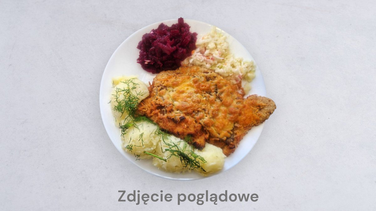 Schab panierowany, placek ziemniaczany z serem wędzonym i kapustą zasmażaną