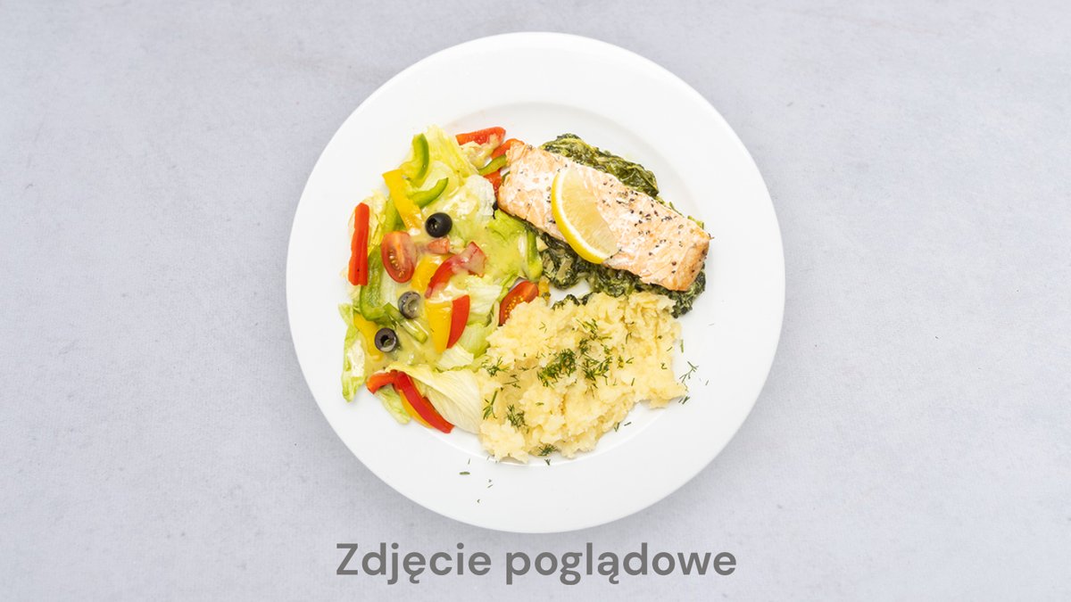 Łosoś smażony na maśle, frytki. Podawany na pierzynce z sałaty i warzyw