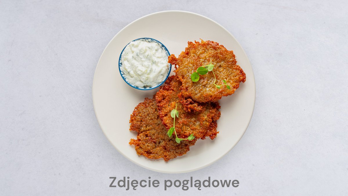 Placek ziemniaczany, sos śmietanowo-serowy, cebula, czosnek, cukinia, łosoś, kiełki, ser